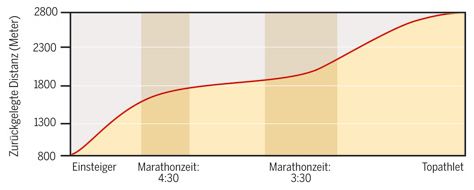 | Distanz, die man in 8 Minuten zurückgelegt hat, auf der vertikalen Skala eintragen, eine waagerechte Linie zur Kurve ziehen und auf der horizontzalen Skala ablesen, wie die Leistung einzuschätzen ist. |